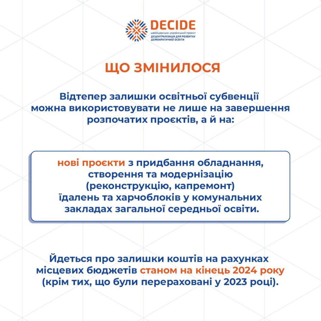 ❗️Постанова Уряду відтепер дозволяє використовувати відповідні залишки не лише на завершення розпочатих у попередньому бюджетному періоді проєктів, а й спрямовувати кошти на придбання обладнання, створення та модернізацію харчоблоків закладів загальної середньої освіти.