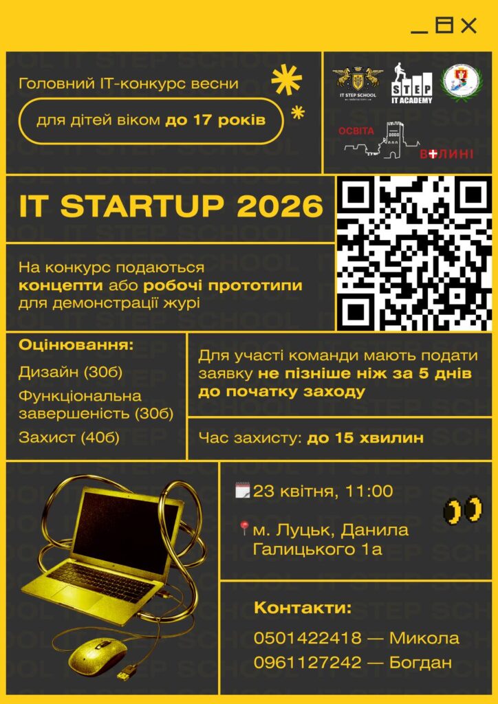 23 квітня 2026 року у Луцьку пройде міський конкурс «IT startup – 2026», що об’єднає дітей та молодь віком до 17 років. Захід організовують Комп’ютерна Академія IT STEP спільно з ПЗЗСО «АЙ ТІ СТЕП СКУЛ ЛУЦЬК» з метою розвитку інформаційно‑технічної освіти, підтримки науково‑технічної творчості та виявлення обдарованої учнівської молоді.